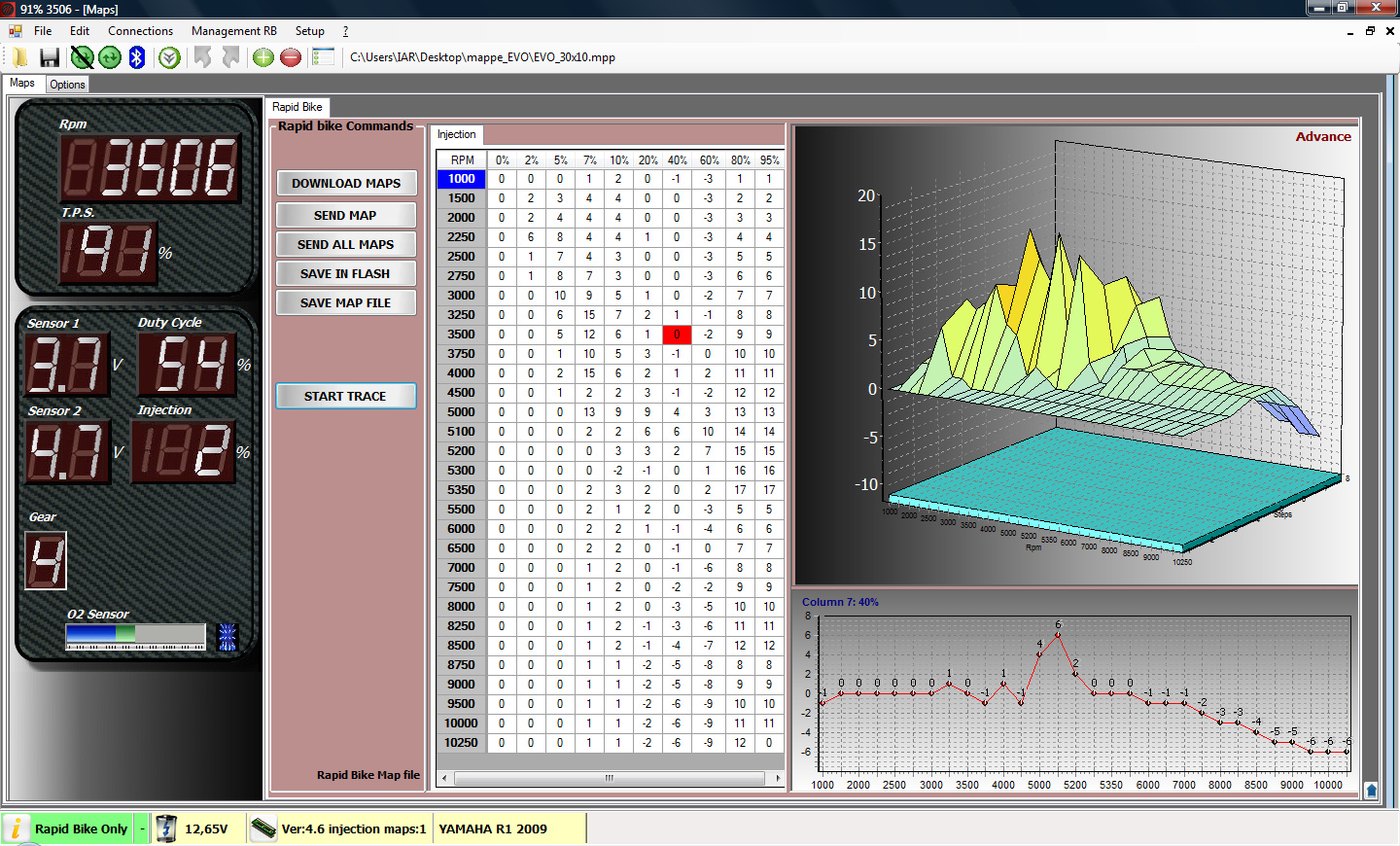 Celem Rapid Bike EVO jest „Pełna kontrola silnika” co oznacza zarządzanie składem mieszanki paliwowo-powietrznej poprzez sterowanie nawet ośmioma wtryskiwaczami na podstawie wskazań sondy lambda. Rapid Bike EVO umożliwia regulowanie dawki wtryskiwanego paliwa (w zakresie od -100% do +150% fabrycznej dawki) w pełnym zakresie obrotów. Kiedy jedziesz motocyklem układ autoadaptacji opracowuje optymalną mapę wtrysku dla aktualnych warunków. Zmiany składu mieszanki wprowadzane przez Rapid Bike EVO skutkują znaczną poprawą parametrów trakcyjnych motocykla. Korekta składu mieszanki uwzględnia także aktualne obroty silnika i otwarcie przepustnicy (TPS). Ostatni wykres w powyższej galerii zdjęć pokazuje istotną poprawę osiągów silnika w wersji fabrycznej (czerwona linia) po 50 km (zielona linia) i po 200 km (brązowa linia) jazdy z włączonym układem autoadaptacji.